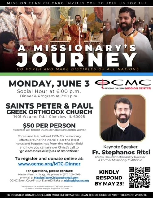 OCMC - A Missionary's Journey→ Monday, June 3, 2024 6:00 PM 8:35 PM Saints Peter and Paul Greek Orthodox Church 1401 Wagner Road Palos Hills, IL, 60465 United States (map) Google Calendar ICS