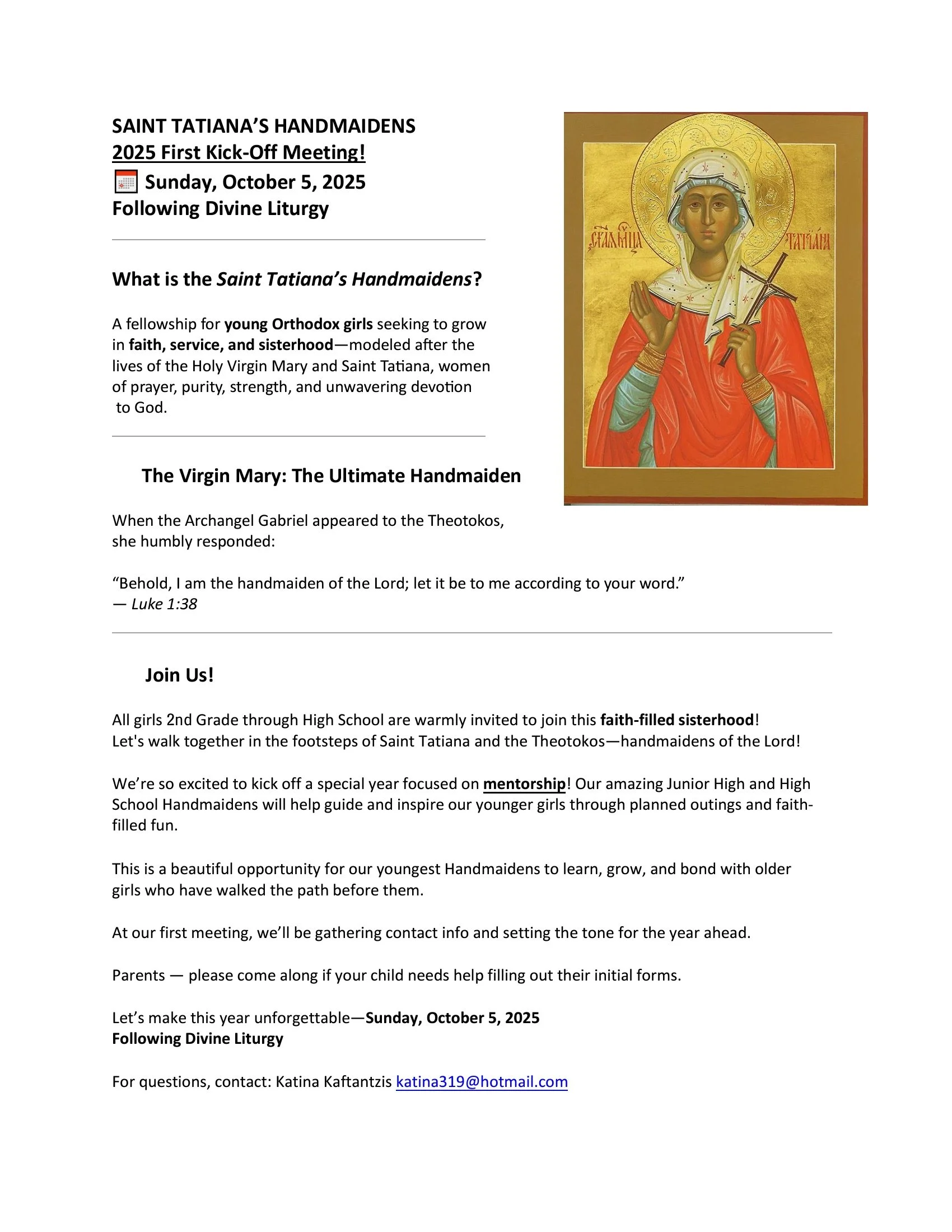 Join us after liturgy on Sunday October 5th. Questions? Please reach out to the Handmaidens sponsor Katina Kaftantzis via email katina319@hotmail.com