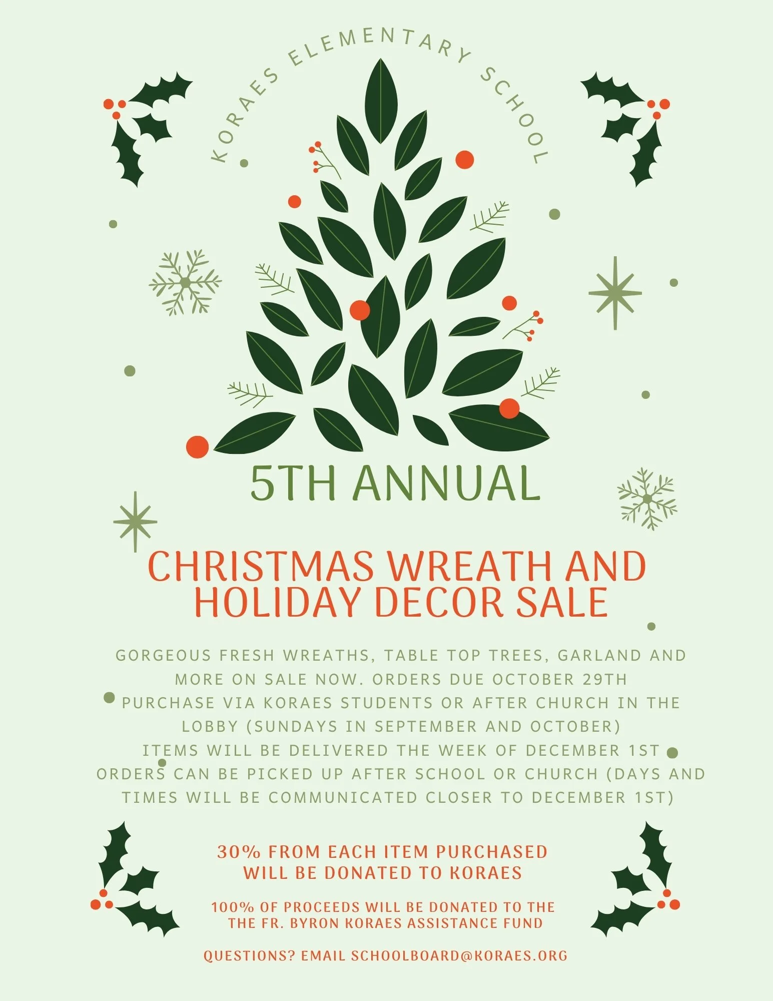 Purchase your fresh Christmas wreaths and holiday decor and support Koraes Elementary School. This year, after church on Sundays starting September 14th or via a current Koraes student, you can purchase from an amazing selection of fresh Christmas decor.